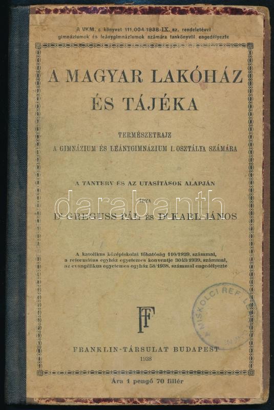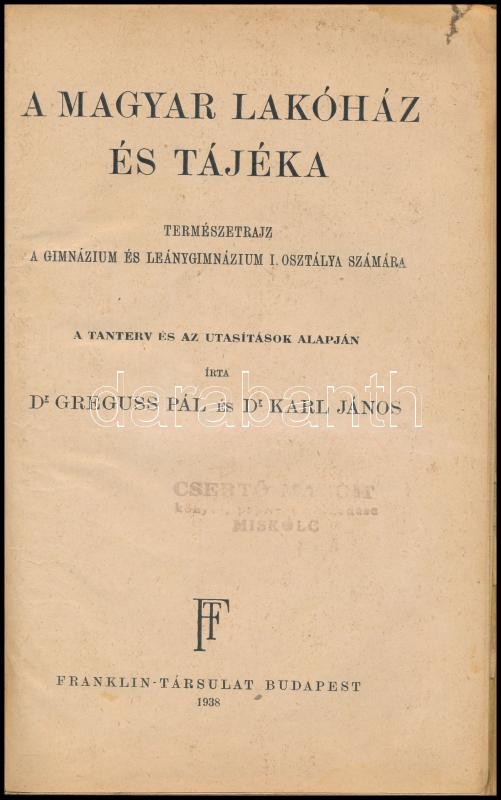Dr. Greguss Pál-Dr. Karl János: A magyar lakóház és tájéka. Természetrajz a gimnázium és a leánygimnázium I. osztálya számára. Bp.,1938, Franklin-Társulat. Átkötött félvászon-kötés, intézményi bélyegzővel, kopott borítóval, foltos, egy szakadt lappal.