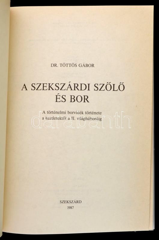 Dr. Töttős Gábor: A szekszárdi szőlő és bor. A történelmi bordvidék története a kezdetektől a II. világháborúig. Szekszárd, 1987, Szekszárdi Nyomda. Kiadói egészvászon-kötés, kiadói papír védőborítóban.