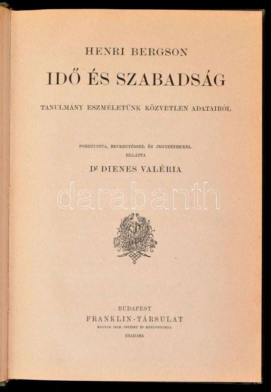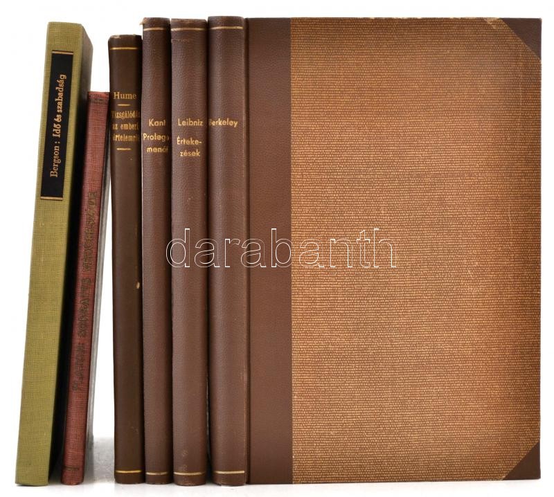 Filozófiai Írók Tára 5 kötete és az Officina könyvtár 1 kötete: [David] Hume: Vizsgálódás az emberi értelemről. Fordította magyarázatokkal ellátta Alexander Bernát. Filozófiai Írók Tára III. kötet. Bp. 1906. Franklin-Társulat, VI+2+207 p. Második, javított és bővített kiadás. Átkötött egészvászon-kötésben, intézményi bélyegzővel, jó állapotban. [Immanuel] Kant: Kant prolegomenái minden leendő metafizikához, mely tudományként fog szerepelni. Fordította magyarázatokkal ellátta Alexander Bernát. Filozófiai Írók Tára VIII. kötet. Bp. 1909. Franklin-Társulat, XVIII+2+128 p. Második, javított és bővített kiadás. Átkötött egészvászon-kötésben, jó állapotban. [Gottfried Wilhelm] Leibniz. Értekezések. Fordították: Dr. Bauer Simon és Dr. Vida Sándor. Bevezetéssel és magyarázatokkal ellátta: Dr. Vida Sándor. Filozófiai Írók Tára VIII. kötet. Bp. 1907. Franklin-Társulat, 224+2 p. Átkötött egészvászon-kötésben, jó állapotban. [George] Berkeley: I. Három párbeszéd Hylas és Philonous közt. II. Értekezés a látásnak egy új elméletéről. Fordította, életrajzzal és jegyzetekkel ellátta: Dr. Dienes Valéria. Filozófiai Írók Tára XXI. Bp., 1909, Franklin-Társulat, 234+1 p. Átkötött félvászon-kötés, jó állapotban. Henri Bergson: Idő és szabadság. Tanulmány elméletünk közvetlen adatairól. Fordította, bevezetéssel és jegyzetekkel ellátta: Dr. Dienes Valéria. Filozófiai Írók Tára új sorozat. Bp., é.n., Franklin-Társulat, 199+1 p. Átkötött félvászon-kötés, jó állapotban. + Platón: Sókratés védőbeszéde. Officina könyvtár 59. Fordította és bevezetővel ellátta: Devecseri Gábor. Bp.,1944,Officina, 60+4 p. Kiadói félvászon-kötés, kissé kopottas borítóval.