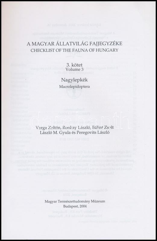 Varga-Ronkay-Bálint-László-Peregovits: Nagylepkék, Macrolepidoptera. A magyar állatvilág fajjegyzéke 3. kötet. Bp., 2004, Magyar Természettudományi Múzeum. Kiadói papírkötés, jó állapotban.