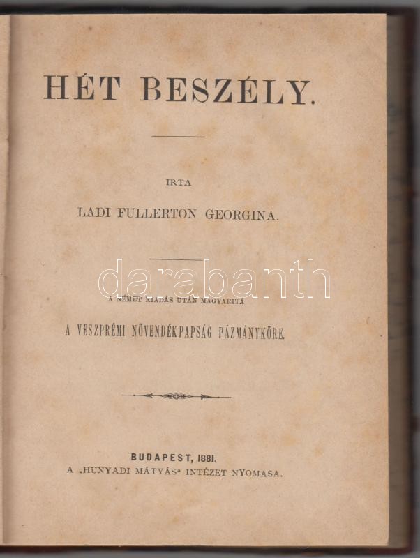 Lady Fullerton Georgina: Hét beszély. Fordította: A Veszprémi Növendékpapság Pázmányköre. Bp., 1881, Hunyadi Mátyás-ny.,XVIII+4+284 p Átkötött félvászon-kötés, kissé kopott borítóval.