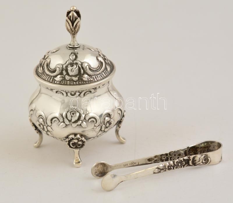 Leírás: Ezüst (Ag.) pirolás szelence és csipesz / Silver sacharin holder 36 g 6,5cm