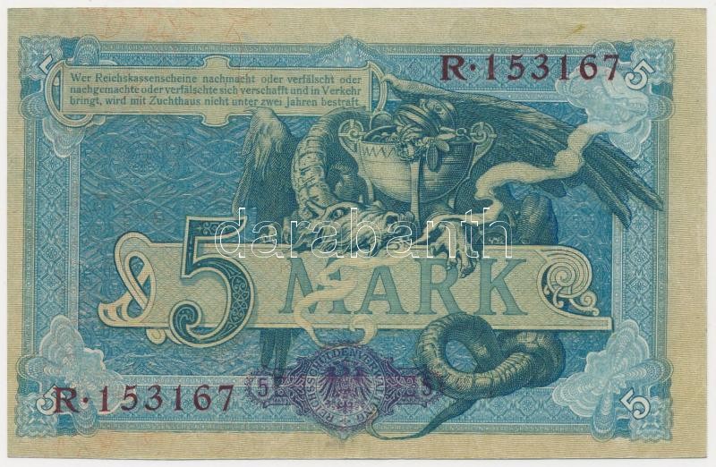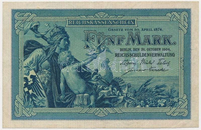 Leírás: Német Birodalom 1904. 5M hat számjegyű sorszám T:III Nagyon szép papír!