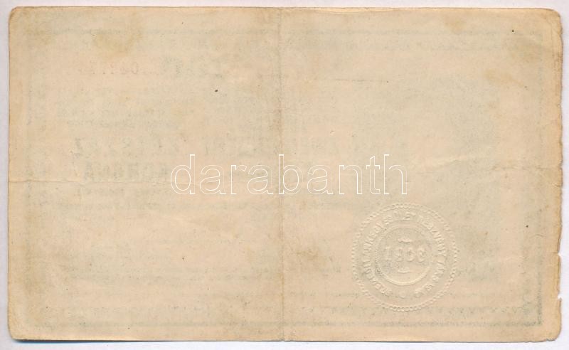 Leírás: 1918. 200K "A 1005" sima hátlappal, hátlapján "SZEGEDI BANKEGYESÜLET RÉSZVÉNY TÁRSASÁG - 1906" szárazpecséttel T:III,III-