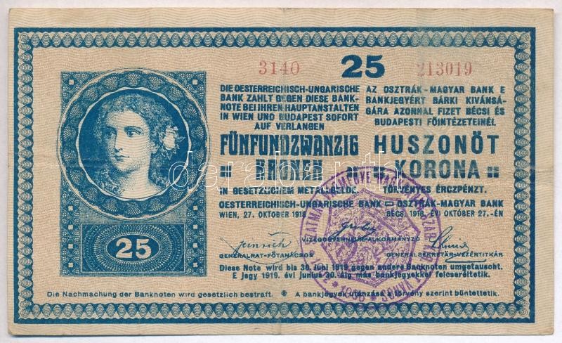 Leírás: 1918. 25K "3140" 3mm, hullámos hátlappal, hamis "Szatmár Vármegye Nagybánya Szab. Kir. R. T. Város" felülbélyegzéssel (fake overprint) T:III,III- fo.