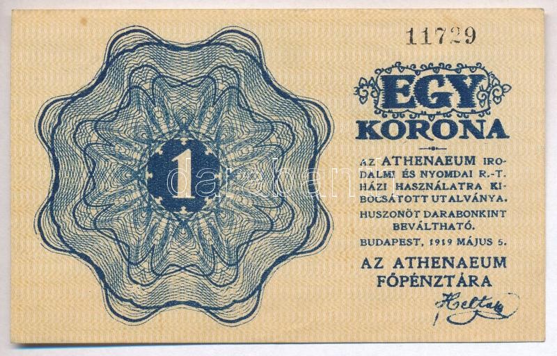 Leírás: Budapest 1919. 1K "Athenaeum Főpénztára" T:II hátoldalán kis ragasztásnyom