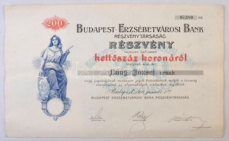 Budapest 1906. "Budapest- Erzsébetvárosi Bank Részvénytársaság&qu... https://www.darabanth.com/hu/325-Gyorsarveres/325.0/Numizmatika/Reszvenyek-es-sorsjegyek~2000005/Budapest-1906-Budapest-Erzsebetvarosi-Bank-Reszvenytarsasag-nevre-szolo-reszvenye-200~II1687359