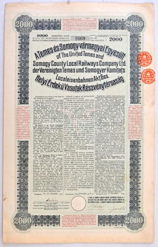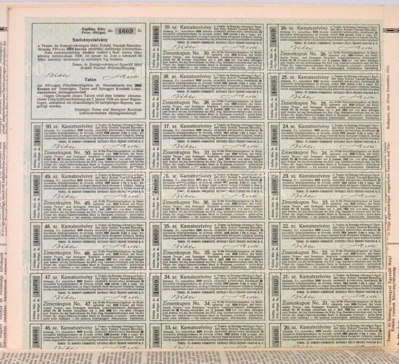 Budapest 1913. "A Temes- és Somogy-vármegyei Egyesült Helyi Érdekű Vasutak Részvénytársaság" részvénye 2000K-ról, angol, magyar és német nyelven, szárazpecséttel T:II-