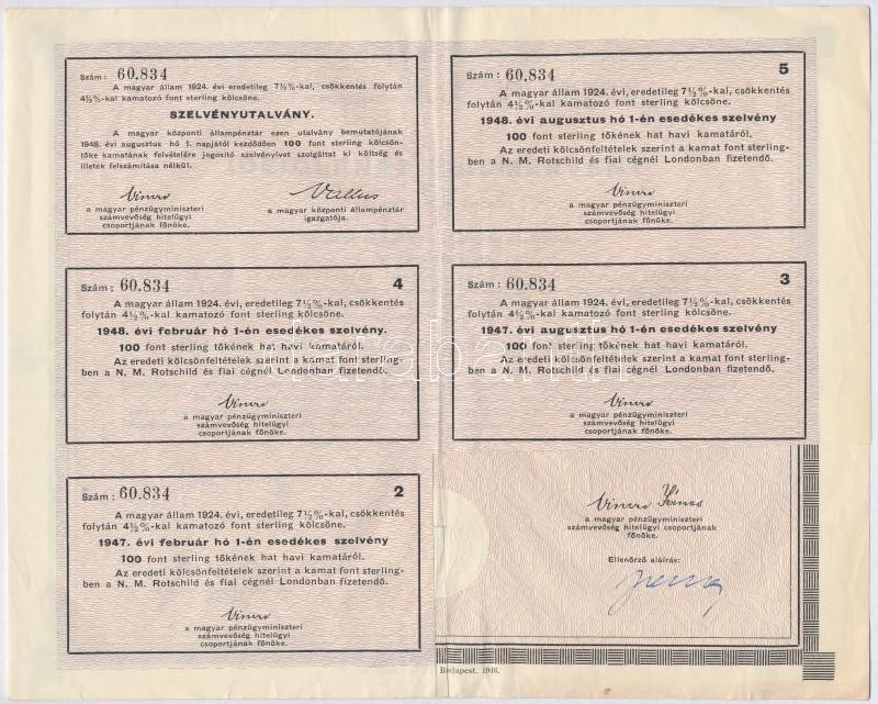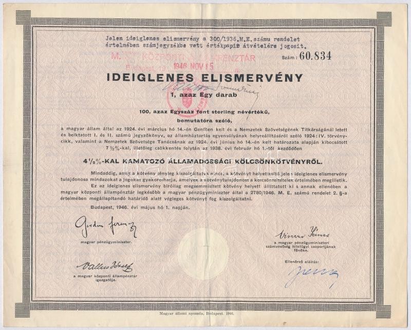 Budapest 1946."4 1/2%-kal kamatozó Államadóssági Kölcsönkötvény" bemutatóra szóló ideiglenes elismervénye 100 font sterlingről szárazpecséttel, bélyegzéssel és szelvényekkel T:III