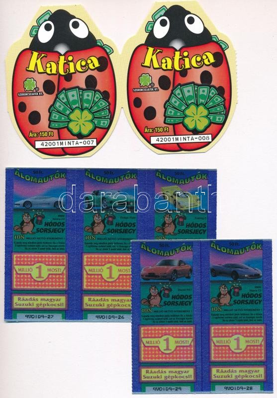 DN "Katica" mint sorsjegy, 4-es ívben + "Hódos sorsjegy... https://www.darabanth.com/hu/325-Gyorsarveres/325.0/Numizmatika/Reszvenyek-es-sorsjegyek~2000005/DN-Katica-mint-sorsjegy-4-es-ivben-plus-Hodos-sorsjegy-5x-2-es-es-3-as-ivben-TI~II1810069
