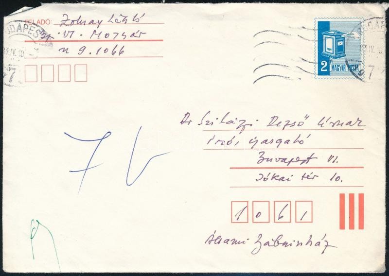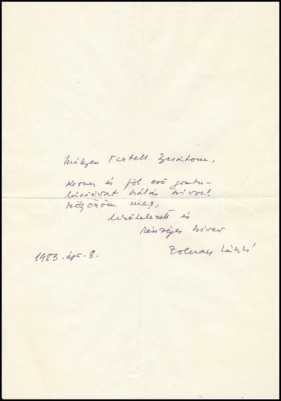 1983 Zolnay László (1916-1985) régész, muzeológus üdvözlő sorai és aláírása egy Szilágyi Dezső (1922-2010) bábművésznek, az Állami Bábszínház igazgatójának szóló levélen, borítékban