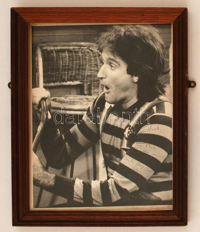 Robin Williams (1951-2014) Oscar-díjas és hatszoros Golden Globe-díjas amerikai komikus, színész, rendező, producer saját kezű aláírása egy a művészt ábrázoló fotón, üvegezett keretben, 25x20cm