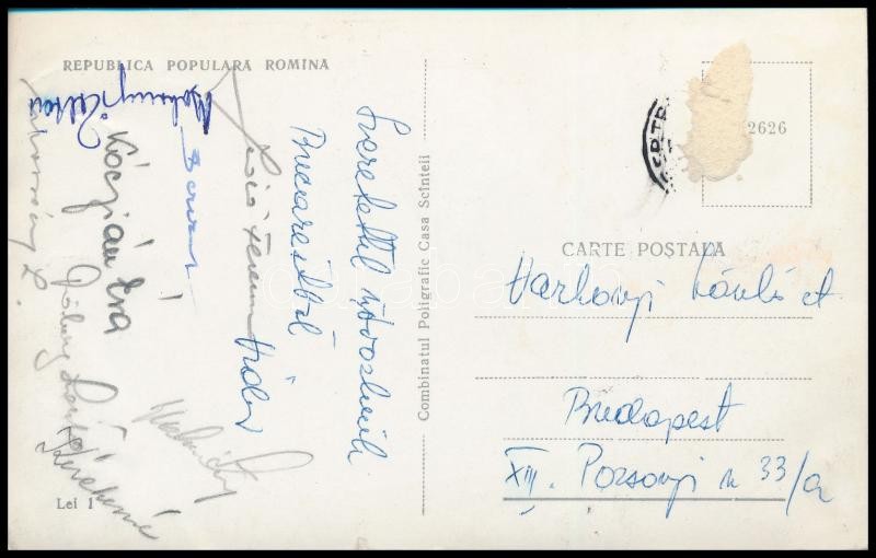 Leírás: cca 1960 Magyar asztaliteniszezők (Sidó Ferenc, Kóczián, Berczik, stb.) aláírásai levelezőlapon