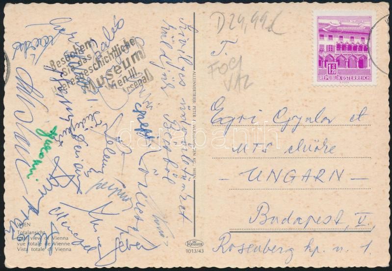 cca 1966 Tatabányai Bányász labdarúgó csapat játékosainak, (Menczel, Korsós, Szabó, Juhos, Szuromi, Deli, Szepesi, Laczkó,Léber, Hidegkuti Nándor edzÅ‘ ...stb. ) közte válogatott labdarúgóknak az aláÃrásai, BécsbÅ‘l Egri Gyula MTS elnöknek.