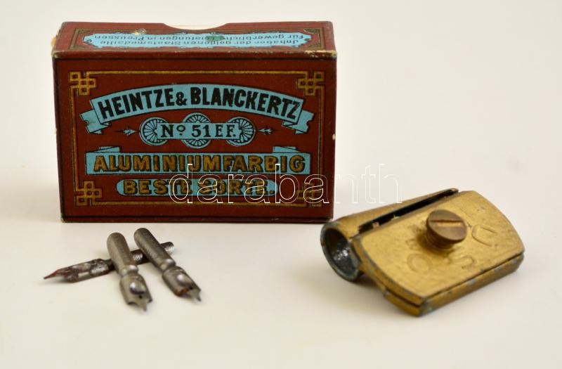 Leírás: 19 db régi tollhegy, Heintze&Blanckertz papírdobozban, régi fém ceruzahegyezővel