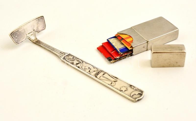 Leírás: 8 db bontatlan borotvapenge (2 db Gillette, Montevideo Gold, Cyrano, 4 db Omega), Gillette fémdobozban+alpakka borotva lehúzóval, jelzett, h: 12 cm.