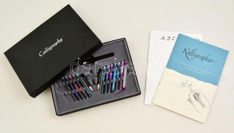 Leírás: Calligraphy szépírás készlet, töltőtollal, 3 különböző heggyel, színes tintákkal, segédlettel, néhány hiányzó, üres patronnal