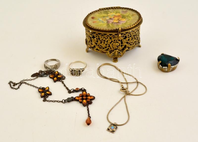 Leírás: Réz ékszeres dobozka, tűgobelin tetővel, 5 db bizsuval, 7×6 cm