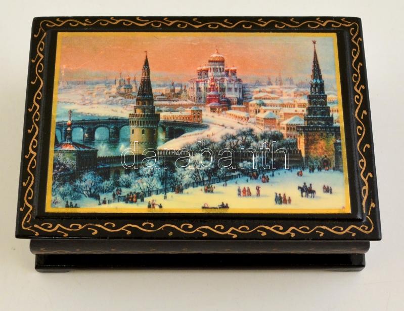 Leírás: Szovjet lakkozott fa doboz, látképpel, jó állapotban, 10,5×7,5×3,5 cm