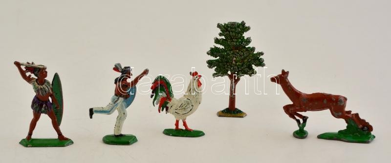 Leírás: cca 1930 Festett kopott ólomkatonák, indián, őz, kakas, fa, 5 db, m: 3,5-7 cm