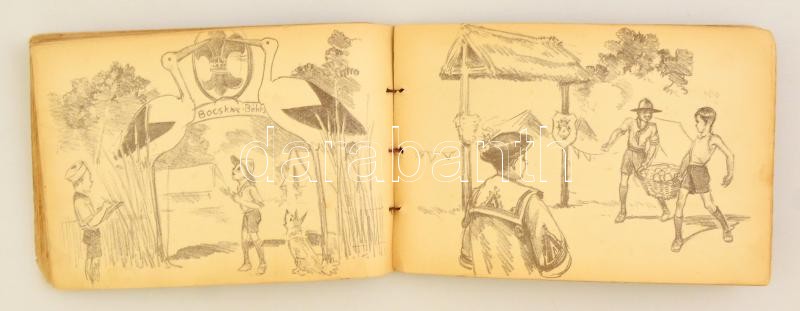 Leírás: 1933 Márton Lajos Gödöllői Jamboree rajzfüzet 40 rajzzal. 14x20cm egy két lap sérült / Jamboree album with drawings of Lajos Márton