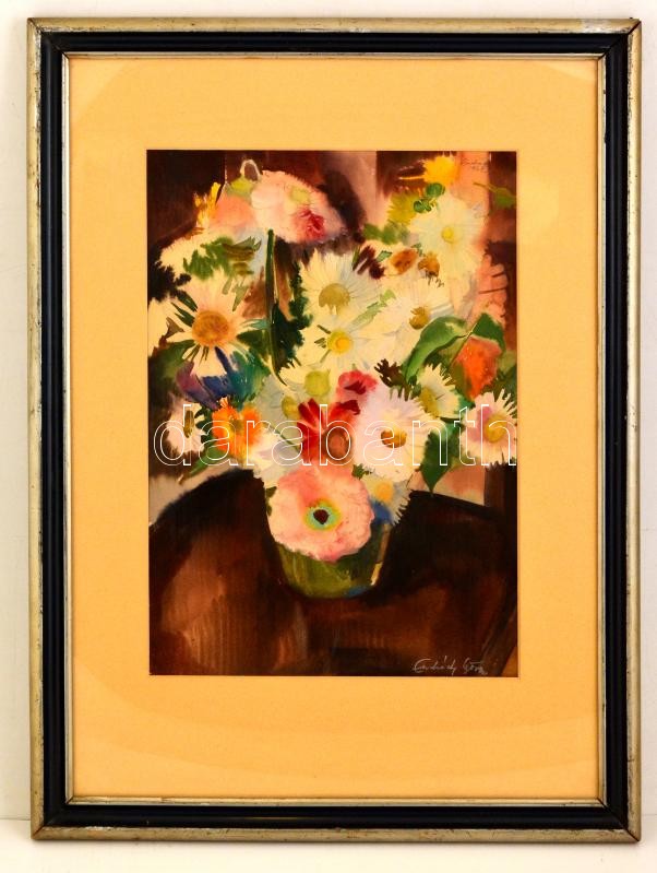 Leírás: Endrédy György (1910-1988): Virágcsendélet. Akvarell, papír, jelzett, üvegezett keretben, 50×34 cm