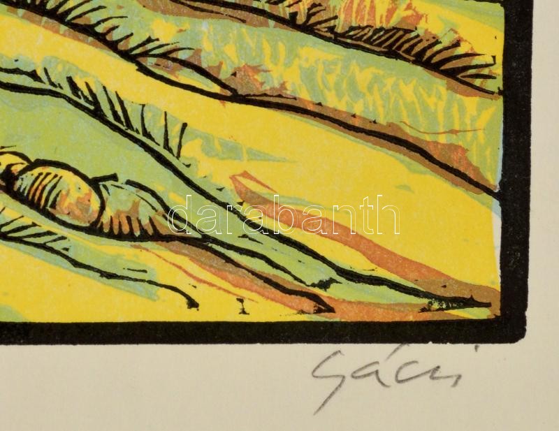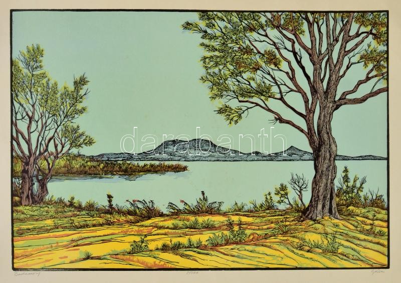 Leírás: Gácsi Mihály (1926-1987): Badacsony, színes linó, papír, jelzett, számozott (5/100), felcsavarva, 35,5×50,5 cm