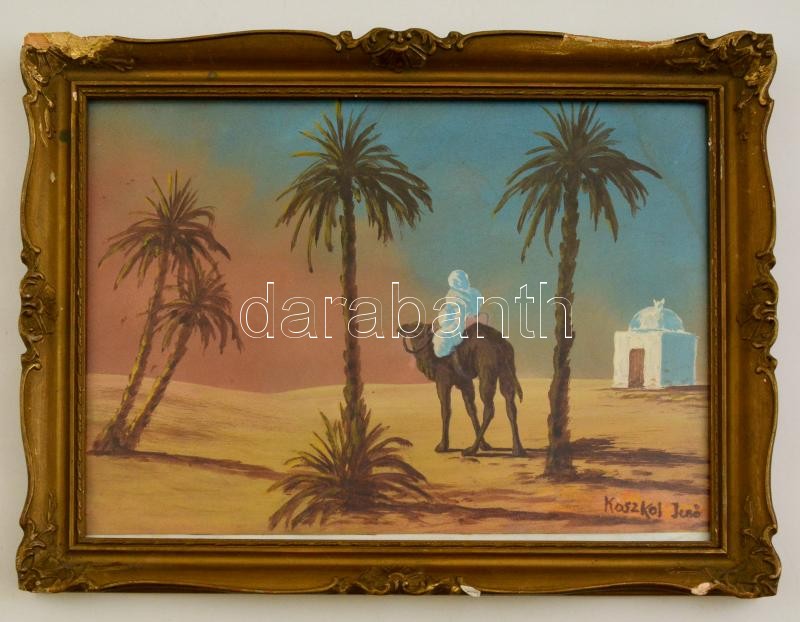 Leírás: Koszkol jelzéssel: Pihenő a pálmafáknál. Vegyes technika, papír, üvegezett keretben, 23×32 cm