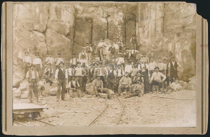 Leírás: 1913 Somoskő, a kőbányában, csoportkép, fotó, kartonra ragasztva, kis sérüléssel, hátulján feliratozva, 15×22,5 cm