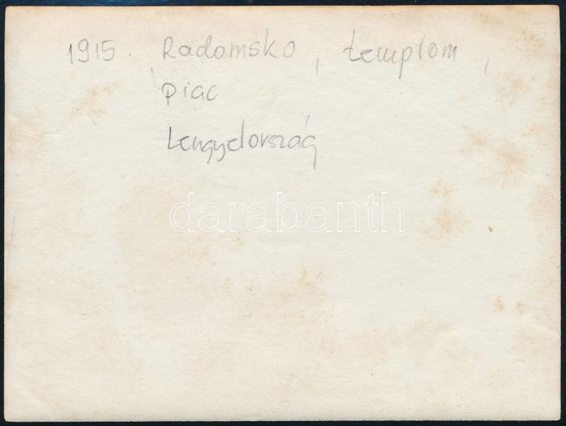 Leírás: 1915 Radomsko (Lengyelország), a piac a templommal, fotó, hátulján feliratozva, 9×12 cm