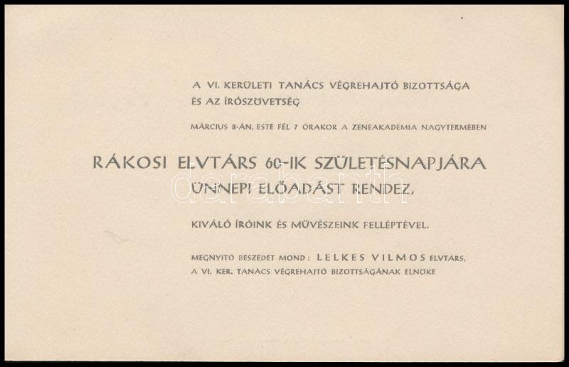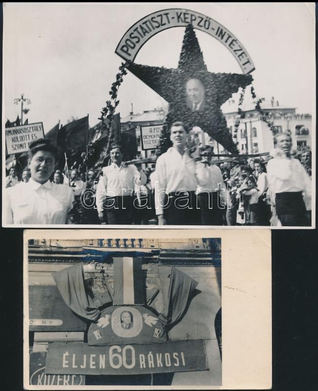 1952 Rákosi Mátyás 60. születésnapja, 2 db vintage fotó Tiszavölgyi József (1909-?) budapesti fotóriporter hagyatékából + hozzáadva egy meghívót Rákosi elvtárs 60. születésnapjára rendezett ünnepségre, 9x14 cm és 13x18 cm