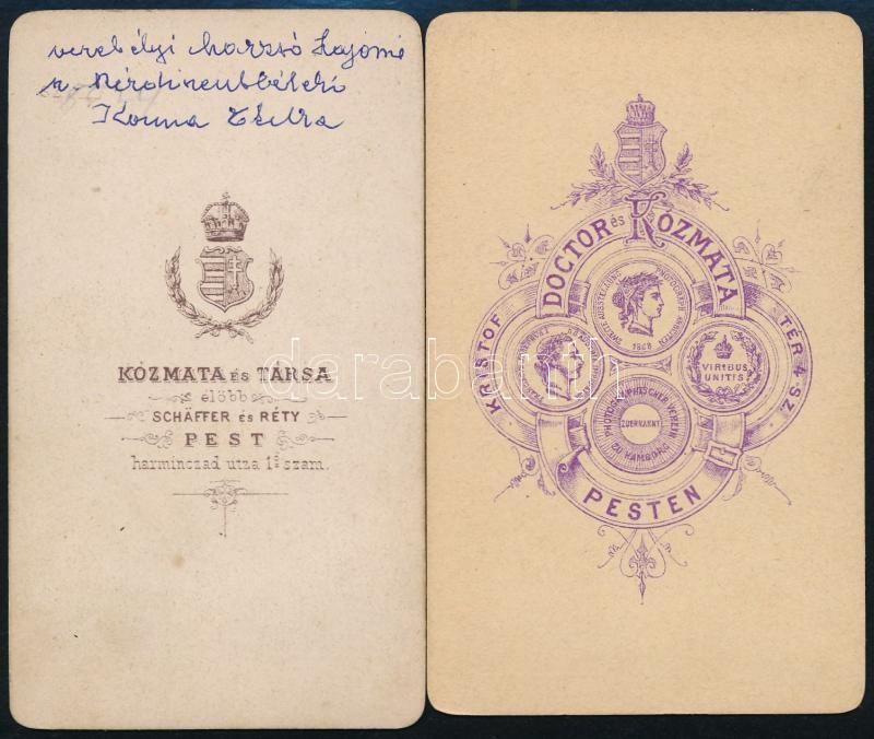 Leírás: cca 1869 Kozmata és Tsa pesti műtermében készült, 2 db vizitkártya méretű fénykép, az egyik feliratozva, 10,5x6,5 cm