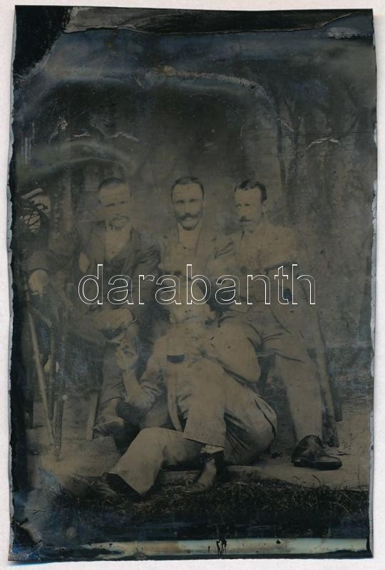 Leírás: cca 1900 Ferrotípia, azaz vaslemezre készült gyorsfénykép egy sörözős társaságról, 9x6 cm