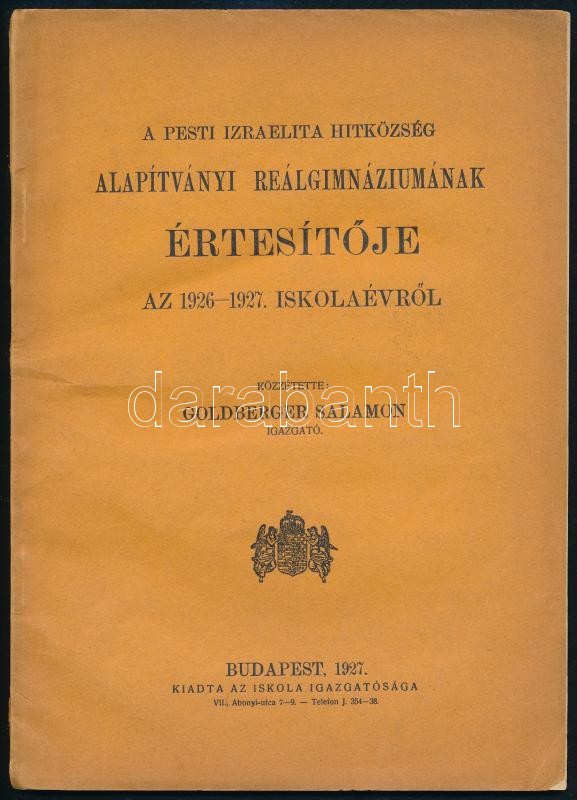 1927 A Pesti Izraelita Hitközség alapítványi reálgimnáziumának értesít... https://www.darabanth.com/hu/326-Gyorsarveres/326.0/Festmeny-mutargy-papirregiseg-egyeb/Judaika~500025/1927-A-Pesti-Izraelita-Hitkozseg-alapitvanyi-realgimnaziumanak-ertesitoje-80-p~II1768296