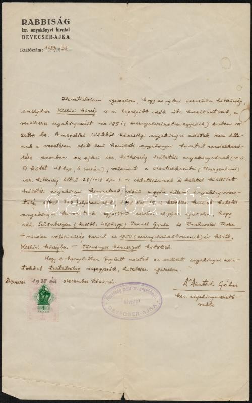 Leírás: 1938 Devecser, Deutsch Gábor (1909-1944) rabbi igazoló okirata házasságkötésről, okmánybélyeggel