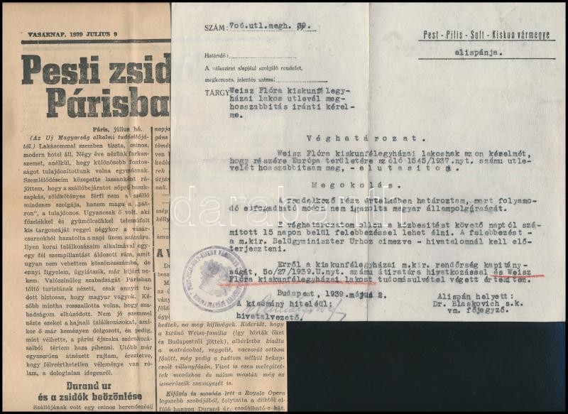 1939 Zsidó személy részére útlevelet megtagadó határozat, és az érinte... https://www.darabanth.com/hu/326-Gyorsarveres/326.0/Festmeny-mutargy-papirregiseg-egyeb/Judaika~500025/1939-Zsido-szemely-reszere-utlevelet-megtagado-hatarozat-es-az-erintett-rokonanak-kozben~II1815259