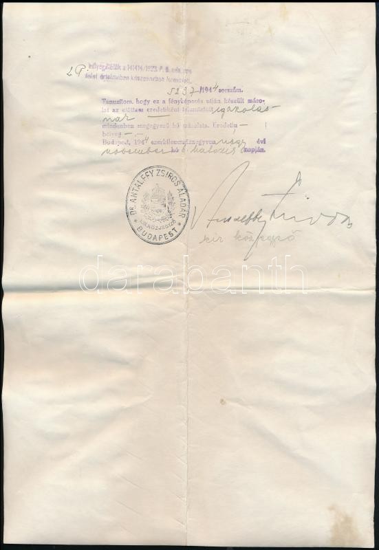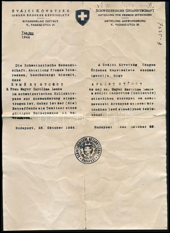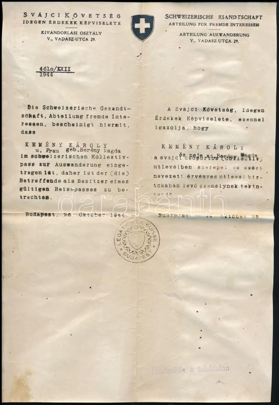 1944 2 db svájci követségi védlevél (Schutzpass) másolata Kemény Károly és felesége, Berény Magda, illetve Kemény György és felesége, Mayer Karolina Lenke részére, az egyik hátulján közjegyzői hitelesítéssel