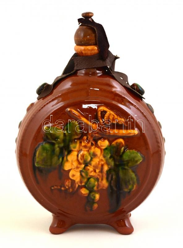 Leírás: Fazekas kulacs bőr fogóval, kézzel festett, mázas kerámia, hibátlan, jelzés nélkül, m: 28 cm