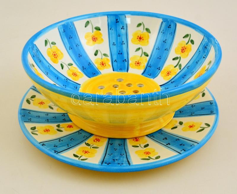Leírás: Gyümölcslemosó és egy tál, kézzel festett mázas kerámia, hibátlan, d:d:24 és 25 cm, m:9 cm