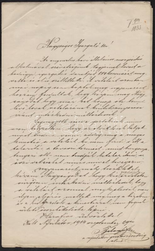Leírás: 1914 Nyírbátor, Mozgósítás miatt vásárolt lovak kifizetésével kapcsolatos irat