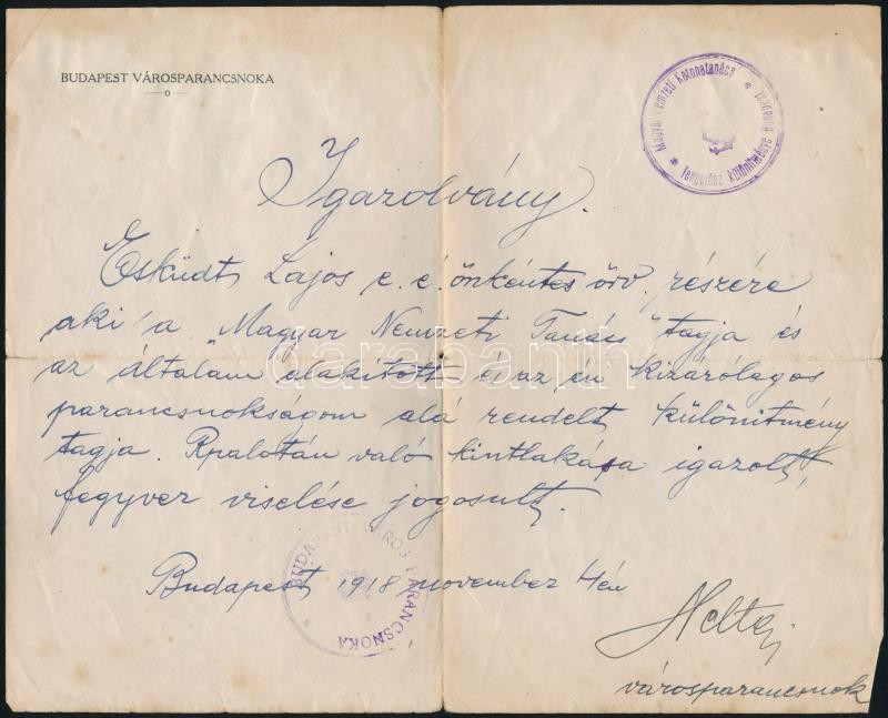 1918 Heltai Viktor, budapesti városparancsnok igazolványa Eskütt Lajos (1896-1957), később Nagyatádi Szabó István titkára, az Eskütt-féle panamaügy főszereplője részére