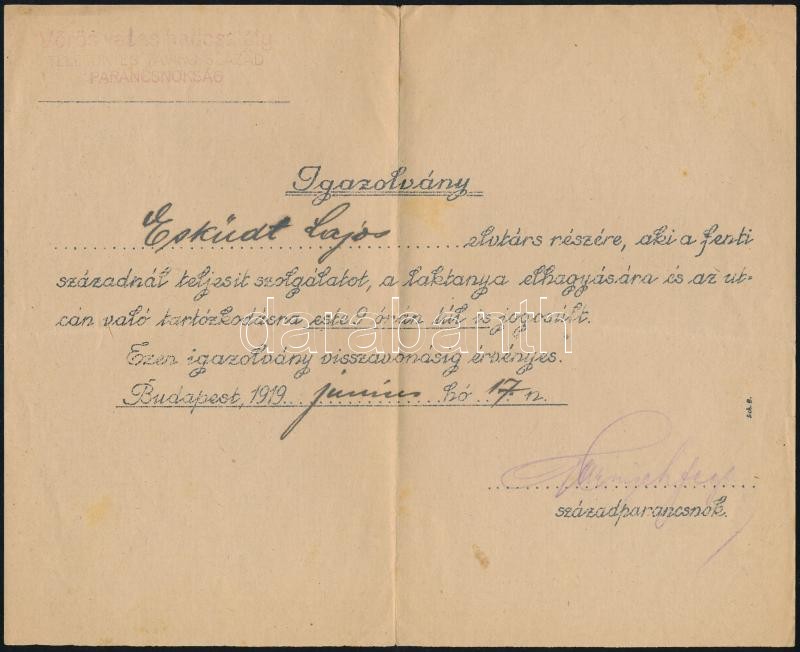 1919 a telefon és távíró század vörös vasas hadosztály igazolványa Eskütt Lajos (1896-1957), később Nagyatádi Szabó István titkára, az Eskütt-féle panamaügy főszereplője részére