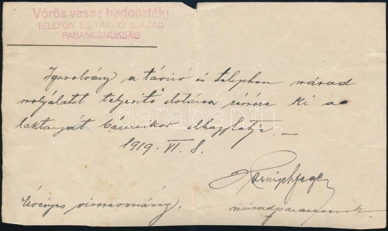 1919 a telefon és távíró század vörös vasas hadosztály igazolványa Esk...