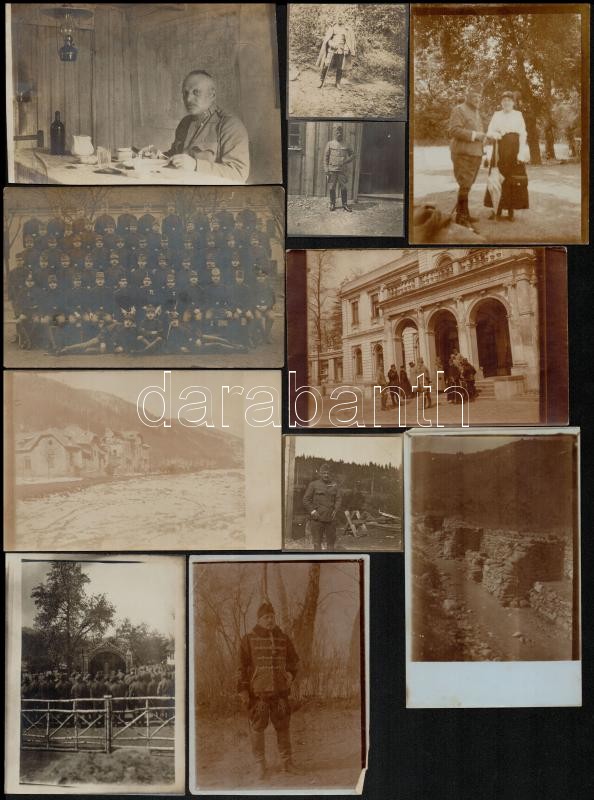 Leírás: cca 1914-1918 Életképek a világháborúból: csoportképek, portrék, stb., 20 db fotó, egy részük hátulján feliratozva, különböző méretben