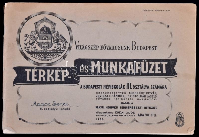 Leírás: 1938 Világszép fővárosunk Budapest -- Térkép és munkafüzet a budapesti népiskolák III. osztálya számára, érdekes bejegyzésekkel, tűzött papírkötésben