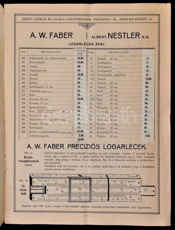 cca 1920-1930 Juszt László és Gyula Látszerészek árjegyzéke. A.W. Faber, A. Nestler, Dannert és Pape precíziós logarlécek és A. Nestler-féle számolóhenger. Első magyar árjegyzéke. 2. kiadás. Bp., Krausz J. és Társa, 10 p.