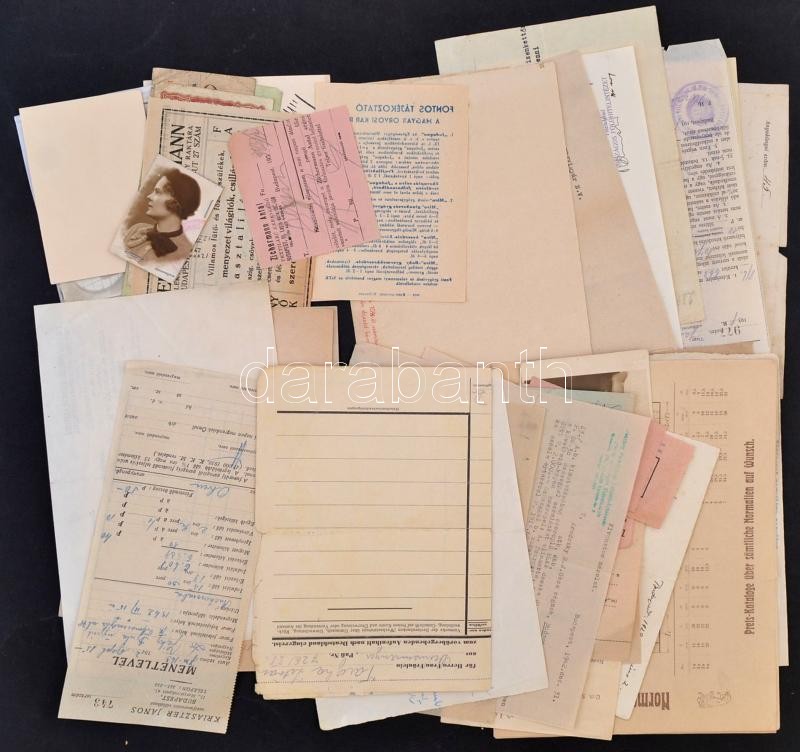 Leírás: cca 1920-1960 Vegyes papírrégiség tétel: közte fotók, reklám nyomtatványok, papírpénzek, okmányok