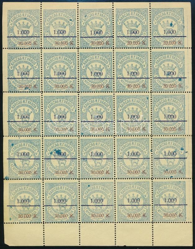 1925 Karcag városi okirat illeték 1.000K/30.000K 25-ös teljes ív https://www.darabanth.com/hu/326-Gyorsarveres/326.0/Festmeny-mutargy-papirregiseg-egyeb/Okmanybelyegek~500016/1925-Karcag-varosi-okirat-illetek-1000K30000K-25-os-teljes-iv~II1813889