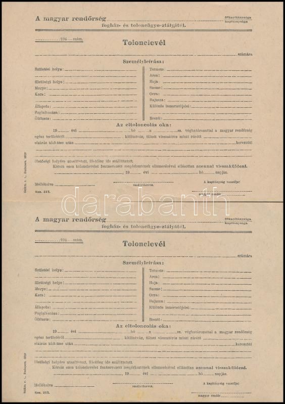 Leírás: 2 db magyar rendőrségi tolonclevél, kitöltetlen.