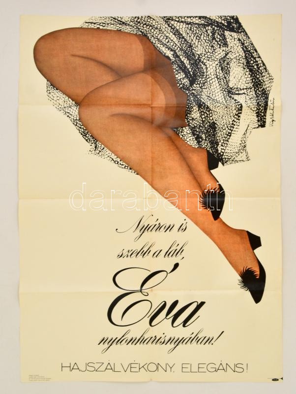 Leírás: 1967 Végh Katalin (?-?): Nyáron is szebb a láb, Éva nylonharisnyában!, reklám plakát, Bp., Magyar Hirdető, Athenaeum-ny., hajtás nyommal, 82x59 cm.